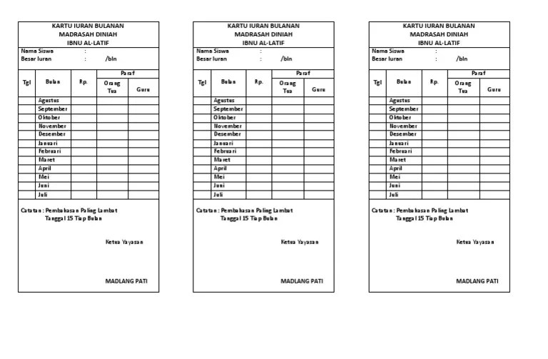 Mar 09, 2021 · contoh kartu iuran bulanan tpa.yang penting dalam kartu tsb. Bulantgliuranttd rt (25000)jimp (3000)rohni (3000)ptgspmbyr jan feb mar aprl mei jun jul agst sep okt nov des mengetahui, bendahara rt bendahara pkk bendahara rohani m. Nah, setiap warga yang telah membayar iuran pun dicatat oleh pihak rt. Berikut adalah contoh format kartu iuran bulanan untuk paud dan tk yang bisa digunakan dan diedit dengan mudah. Bila anda sibuk atau tak memiliki banyak waktu.